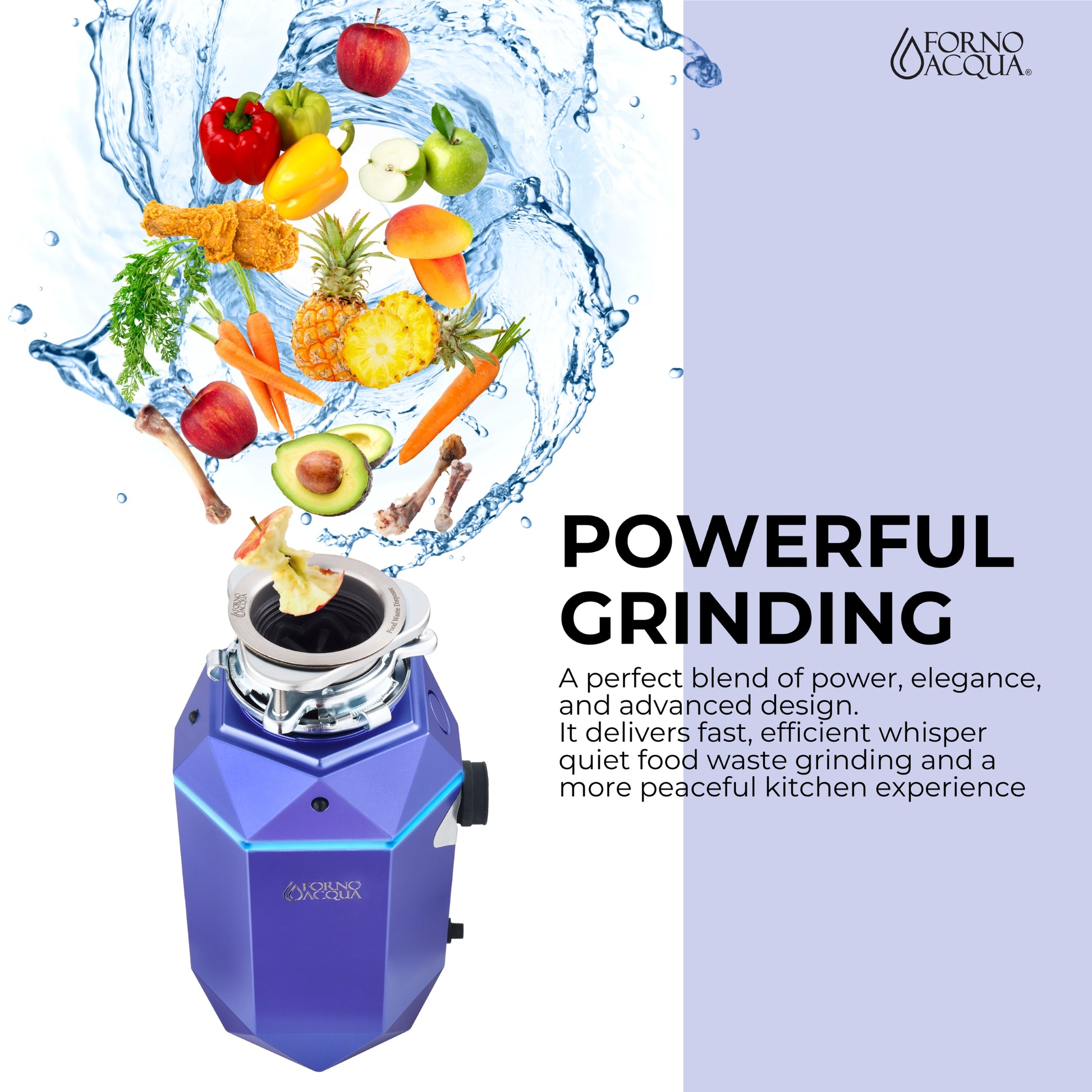 FORNO ACQUA BrightDIAMOND Amethyst 1HP Super Quiet Garbage Disposal Corded with Motion Sensor Cabinet Light & Pre-Wired Air Switch