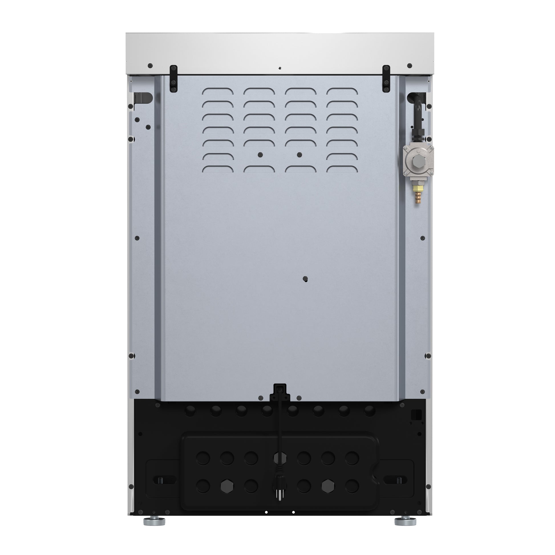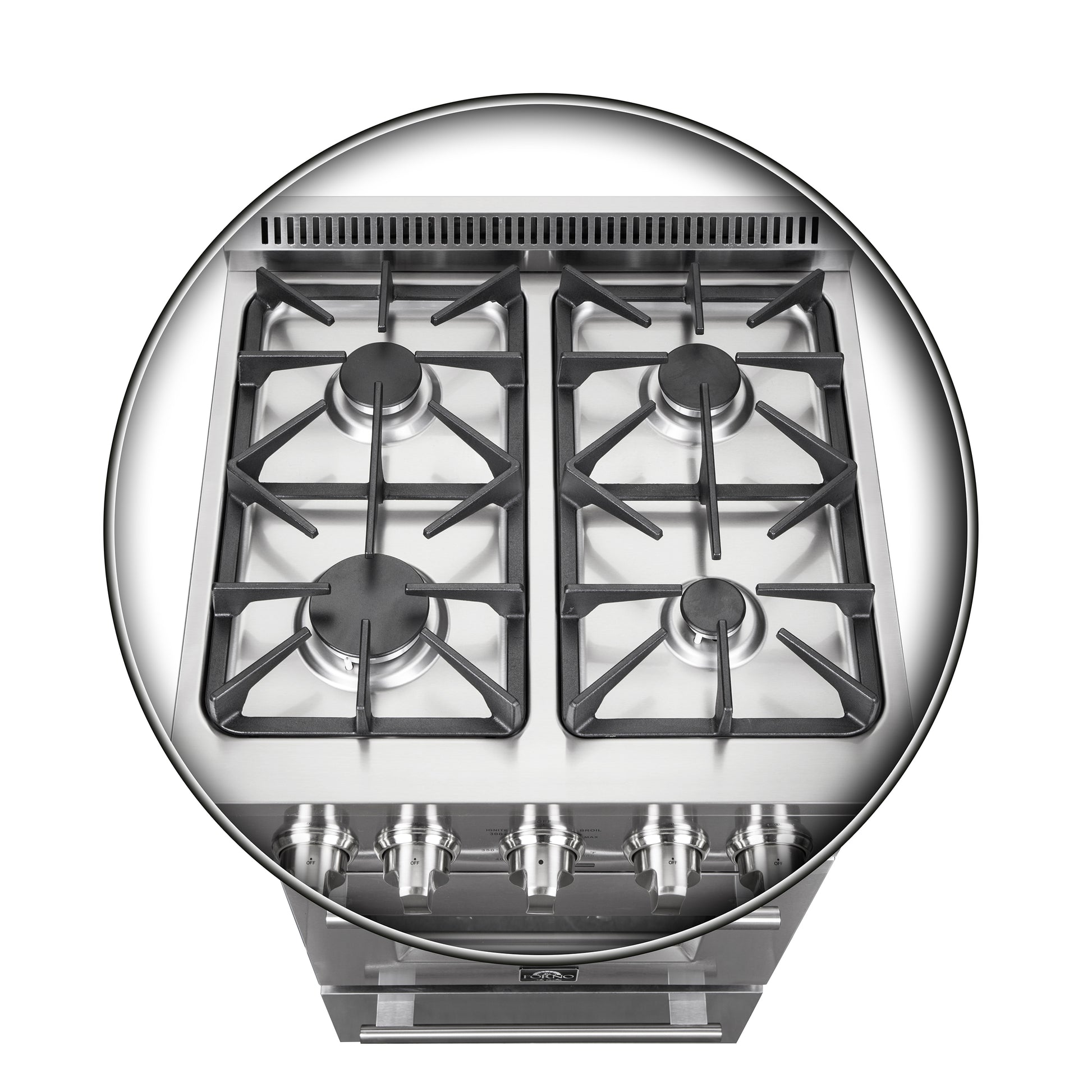 The Forno Breno 24 Inch Alta Qualita Pro-Style Freestanding Gas Range brings professional styling and Performance into your home kitchen with its durable stainless-steel design. Cooking Surface has with 4 sealed burners with a total output of 38,000 BTU and features continuous cast iron grates. The convection oven has a capacity of 2.3 cu. ft. with a combined broil and oven output of 13,000 BTU. Included are 2 electroplated oven racks, LP conversion kit, air-fryer kit and power cord. Additionally, zinc coated metal knobs with bezel rings will maintain their beauty for years.