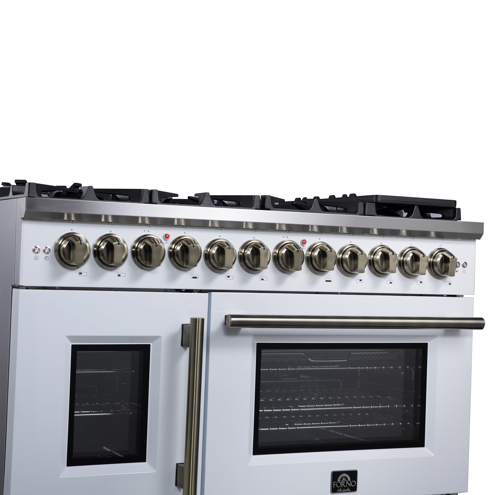 Forno Capriasca 48 Inch Freestanding French Door Dual Fuel Range in White with Antique Brass Accessories, 8 Burners, True Convection Oven