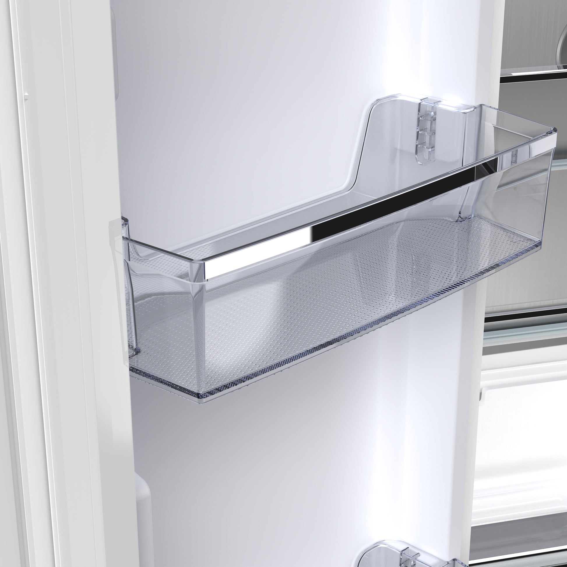 * Fresh food compartment offers 3 glass shelves, 4 spacious door bins, and 2 crispers for organized, flexible storage.